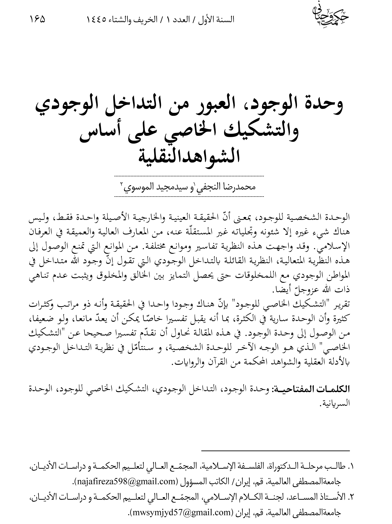 In their efforts, the authors try not only to show the correct interpretation of the “specific gradation of existence” theory which is the other side of “personal unity of existence”, but also to take a critical look into the “interpenetrated existence” theory as per rational arguments and firm evidences from the Qur’an and traditions.
